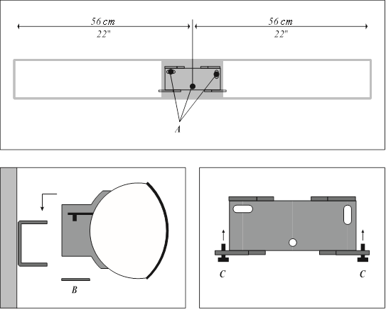 - Kiinnitä BeoLab 3500 kiinnikkeeseen kahdella ruuvilla (C) ja kiinnitä harmaa muovikansi takaisin (B).