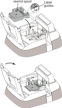 - Varmista, että teippi ja nauha ovat kireällä kasetin suun yli ja että teippi kulkee tarraohjainten välistä.