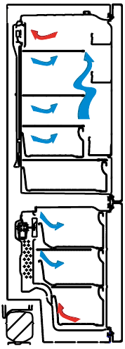 Jääkaappilokerossa tuulettimen puhaltama ilma, joka sijaitsee jääkaappilokeron yläosassa, jäähtyy kulkiessaan ilmanvaihtokanavan takana olevan raon läpi. Samanaikaisesti ilma puhalletaan ulos ilmanvaihtokanavan reikien läpi, jolloin kylmä ilma leviää tasaisesti koko jääkaappilokeroon.