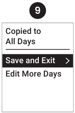 - Jos päätät kopioida, näet tämän vahvistusviestin, jonka jälkeen voit palata Modify (Muokkaa) -valikkoon tehdäksesi muutoksia toiseen päivään valitsemalla Edit More Days (Muokkaa lisää päiviä) tai palata aloitusnäyttöön valitsemalla Save and Exit (Tallenna ja poistu).