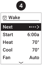 - Säädä Wake (Herätys) -tiedot (Start (Aloitus), Heat (Lämpö), Cool (Viileä), Fan (Tuuletin) ja/tai valitse Next (Seuraava) jatkaaksesi