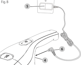 - Kuva B - Kytke liitinpistokelaturin 4 liitinpistoke 5 imurin latausporttiin 6.