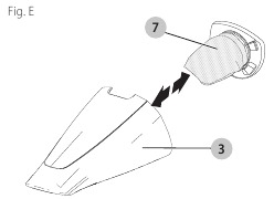 - Pidä pölysäiliötä roskakorin yläpuolella ja vedä suodatin 7 ulos sisällön tyhjentämiseksi kuvassa E esitetyllä tavalla.