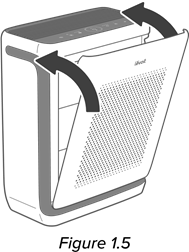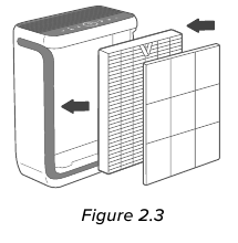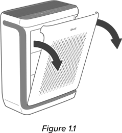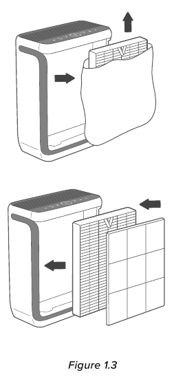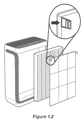 - Poista muovipakkaus suodattimesta ja aseta suodatin ja esisuodatin takaisin ilmanpuhdistimeen. [Kuva 1.3]