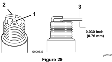Vaihda haljennut, likaantunut tai likainen sytytystulppa. Älä puhdista elektrodeja, koska sylinteriin pääsevä hiekka voi vahingoittaa moottoria. - Aseta tulpan kärkiväliksi 0,76 mm kuvan 29 mukaisesti.