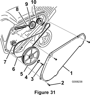 - Irrota käyttöhihnan suojus irrottamalla 3 pulttia kuvan 31 mukaisesti.