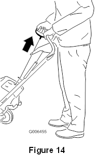 Älä käytä pohjustuspumppua tai rikastinta, jos moottori on ollut käynnissä ja on kuuma. Liiallinen pohjustus voi hukuttaa moottorin ja estää sen käynnistymisen. - Vedä käynnistyskahvasta (kuva 14).