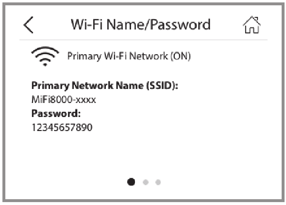Depuis l'écran d'accueil, appuyez sur Wi-Fi Name and Password (Nom et mot de passe Wi-Fi) pour ouvrir l'écran Nom/Mot de passe Wi-Fi.