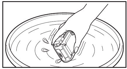 - Immergez l'appareil photo (objectif en premier) dans un seau ou tout autre récipient d'eau douce et déplacez-le vigoureusement de gauche à droite, ou rincez l'appareil photo directement sous un jet d'eau du robinet modérément fort tout en actionnant les boutons et en ouvrant et fermant l'écran.
