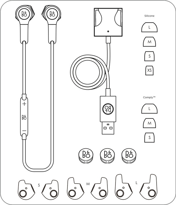 La boîte contient les écouteurs sans fil Beoplay H5, un chargeur, trois serre-câbles, des embouts en silicone en quatre tailles et des embouts Comply en trois tailles.