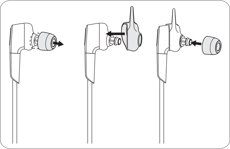 Le Beoplay H5 comprend des embouts en silicone et des embouts Comply offrant un ajustement extra sécurisé et une membrane SweatGuardTM qui empêche l'humidité et le cérumen de pénétrer dans le port sonore. Le Beoplay H5 est livré avec des embouts en silicone de taille moyenne. Lorsque vous utilisez les embouts en mousse ComplyTM, pressez l'embout en mousse et roulez-le pour en faire un cylindre fin et rond. Tirez l'oreille vers l'arrière et vers le haut dans le canal.