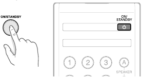 - Appuyez sur ON/STANDBY (MARCHE/VEILLE) sur la télécommande ou le récepteur pour allumer le récepteur. L'indicateur STANDBY est éteint. Appuyez à nouveau pour mettre le récepteur en mode veille et l'indicateur STANDBY s'allume en rouge.