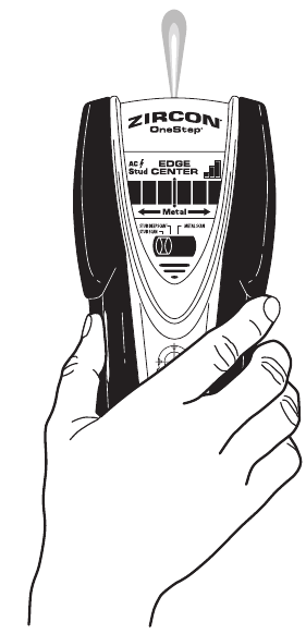 La fonction de détection WireWarning® de Zircon fonctionne en continu dans tous les modes. Lorsque une tension CA sous tension est détectée, l'indicateur d'avertissement de détection CA s'affiche. Si le balayage commence au-dessus d'un fil CA sous tension, l'indicateur CA clignotera en continu. Si cela se produit, relâchez le bouton Power (Alimentation), déplacez l'outil et réétalonnez-le dans un nouvel emplacement. Une fois l'étalonnage terminé, commencez à faire glisser l'outil dans la direction de votre étalonnage initial.