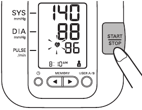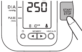 Si votre pression systolique est connue pour être supérieure à 220 mmHg, appuyez et maintenez le bouton START/STOP (Démarrage/Arrêt) jusqu'à ce que le moniteur se gonfle de 30 à 40 mmHg de plus que votre pression systolique attendue.