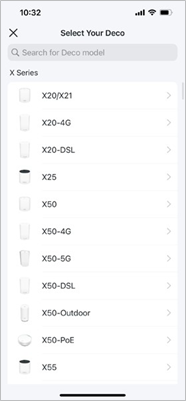 Recherchez et sélectionnez votre modèle Deco. Si vous avez plus d'un modèle Deco, appuyez sur la question sous la barre de recherche pour vérifier comment maximiser le réseau global. - Branchez votre Deco
