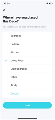 Sélectionnez ou personnalisez un emplacement pour votre Deco. L'emplacement sera utilisé comme nom de votre Deco. - Connectez votre Deco à Internet