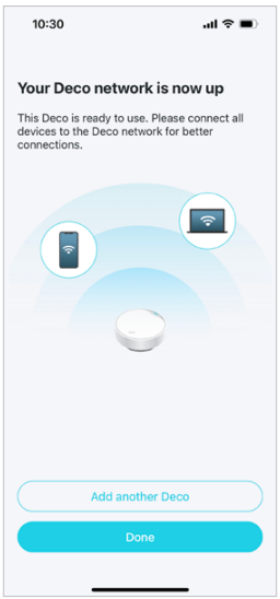 Votre réseau Deco est maintenant opérationnel. Vous pouvez connecter vos appareils au réseau Deco. Si vous avez d'autres Decos, appuyez sur Add another Deco (Ajouter un autre Deco) pour les ajouter à votre réseau.