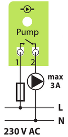 Pump output - this is a volt free output (COM / NO) that controls the circulation pump in the heating / cooling system. The output closes (pump starts) always after 3 minutes from the moment of receiving the heating / cooling signal from any of thermostats paired with wiring centre. The output opens (pump stops) 3 minutes after the last demand for heat/cool sent by the thermostat.