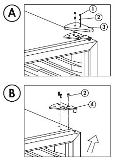 - Remove the rubber screw covers, the screws, the hinge cover and the upper hinge from the top right side of the appliance. See figures A and B.