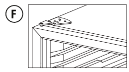 - Install the door on the lower hinge and then install the upper hinge and hinge cover on the top left side of the appliance. Before tightening the screws securing the upper hinge, ensure that the top of the door is level with the top of the appliance, that the actuator is making contact with the switch at the bottom of the appliance and that the rubber gasket is making a good seal with the appliance all the way around. See figure F.