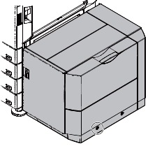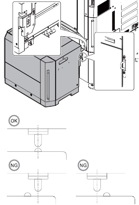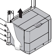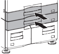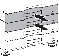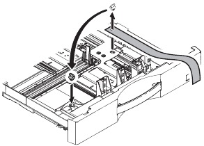 - In the case of a shift to the right, press the front upper section and fit the height adjustment check rib so that it is in the same line with the axis line of the mounting plate upper. Insert the large capacity tray into the main unit.