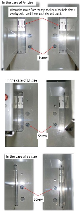 - Loosen two fixing screws (red screws) of the front/rear size guide adjustment plate, and move the size guide adjustment plate in the direction B (F side) by the shift amount, and tighten the red fixing screws (2 for each).