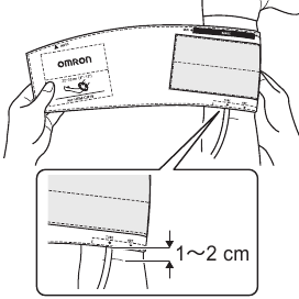 - The bottom edge of the arm cuff must be 1 to 2 cm above the inside elbow.