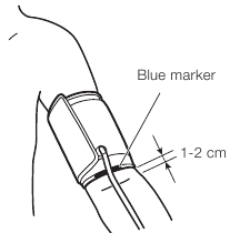 - Prilikom postavljanja manžete, podesite položaj manžete tako da se plavi marker nalazi u sredini vaše ruke, a rub manžete bude 1-2 cm iznad vašeg lakta.