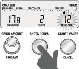 - Odaberite potrebnu količinu mljevene kave pritiskom na SHOTS / CUPS button (gumb za doze / šalice).
