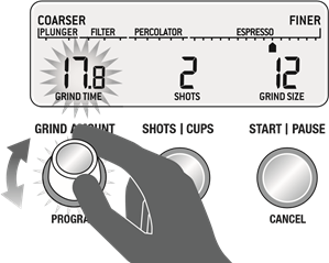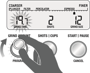 - Pritisnite i otpustite START / PAUSE / CANCEL button (gumb za pokretanje / pauziranje / poništavanje) za pokretanje mljevenja.