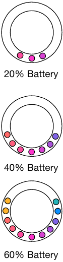 Kada je uključen, puni spektar svjetala pojavit će se oko woofera UberTM Boom Ultra na 1 sekundu. Nakon toga, svjetla woofera bit će upaljena ili ugašena 2 sekunde kako bi odgovarala trenutnom postotku baterije. Pogledajte slike desno za primjer.