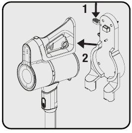 - Pritisnite gumb za otpuštanje uređaja (7) na priključnoj stanici za punjenje (8) prema dolje i istovremeno povucite uređaj prema sebi.