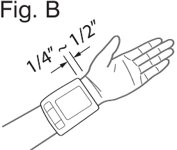 - Provjerite je li rub manžete oko 1/4"~1/2" (1 cm) od dlana kao što je prikazano na slici B.