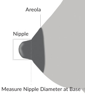 Spectra S2 dolazi sa štitnicima za dojke veličine 24 mm. Ovo je najčešće korištena veličina štitnika; međutim, mnogim ženama bolje će odgovarati druge veličine. Pravilno odabrana veličina štitnika za dojke važna je kako bi se osigurala najbolja izvedba vaše izdajalice. Nepravilno postavljen štitnik za dojke može ometati izlaz mlijeka, uzrokovati nelagodu, au ekstremnim slučajevima i ozljede. Kako biste odredili veličinu štitnika koja vam je potrebna, izdajajte se 5 minuta koristeći priložene štitnike. Vaše će se bradavice proširiti dok se mlijeko izlučuje, stoga je važno izmjeriti ih nakon što nateknu kako biste bili sigurni da će veličina koju odaberete pružiti dovoljno prostora. Nakon izdajanja izmjerite promjer bradavica u bazi kao što je prikazano na slici desno. Ponovite postupak nekoliko puta kako biste bili sigurni da imate točnu mjeru. Odaberite veličinu štitnika koja je 2-3 mm veća od ove mjere.