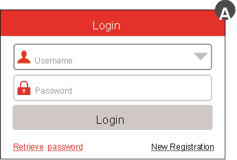 - Alkalmazásfiók létrehozása: Érintse meg a "New Registration" (Új regisztráció) lehetőséget az A ábrán, adja meg az információkat (a *-gal jelölt elemeket ki kell tölteni), majd érintse meg a "Register" (Regisztráció) lehetőséget. Lásd a B ábrát.