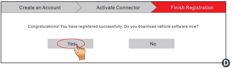 - Regisztráció befejezése: Érintse meg a "Yes" (Igen) lehetőséget a járműszoftver letöltési képernyőjének megnyitásához. Lásd a D ábrát. A későbbi letöltéshez érintse meg a "No" (Nem) lehetőséget.
