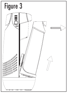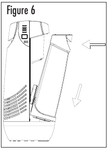 - Amikor megtelt, vigye a tartályt a párásítóhoz, és helyezze a házba. A tartály házba helyezéséhez használja a 6. ábrán látható helymeghatározó füleket a készülék alján, hogy a tartály alját egyenletesen igazítsa a házhoz enyhe szögben. Miután a tartály alja egy vonalba került, a fogantyú segítségével nyomja a tartály tetejét a helyére. Kattintást fog hallani, amikor a tartály megfelelően rögzítve van. A tartály 1,2 gallon vizet tartalmaz. A tartály azonnal elkezd kiürülni az alapba. (Lásd a 6. ábrát)