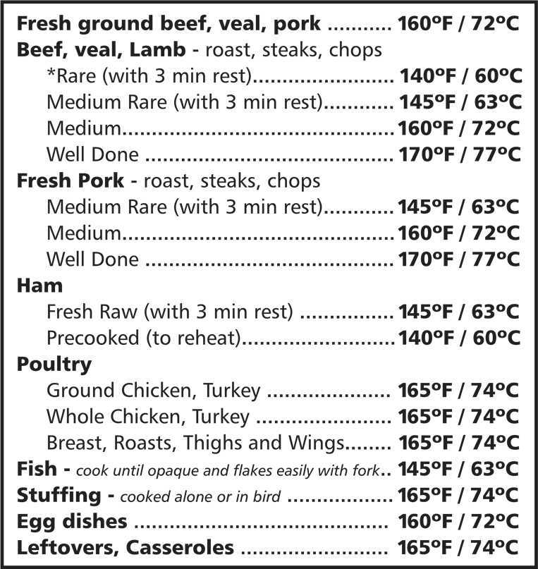 Most jön a legfontosabb rész - a minimális BELSŐ hőmérsékletek, amelyeket az élelmiszernek el kell érnie ahhoz, hogy biztonságosan fogyaszthatónak minősüljön, függetlenül attól, hogy hogyan készíti el. A következő irányelveket ajánljuk, de a személyes ízlés szerinti hőmérsékletek eltérhetnek az alábbiaktól: