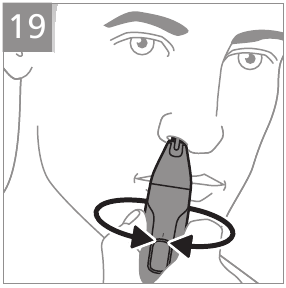 Ne helyezze a vágóelemet túl mélyre az orrlyukakba (max. 12 mm). - Mozgassa a vágóelemet az orrlyukba be és ki határozott, forgó mozdulatokkal, hogy a szőrszálakat rövidebbre vágja. Ügyeljen arra, hogy a vágófogak érintkezzenek a szőrszálakkal úgy, hogy a vágófejet az orrlyukában forgatja. Forgatás közben a trimmer lapos oldalát a bőrhöz tarthatja, hogy csökkentse az esetlegesen fellépő csiklandozó hatást.