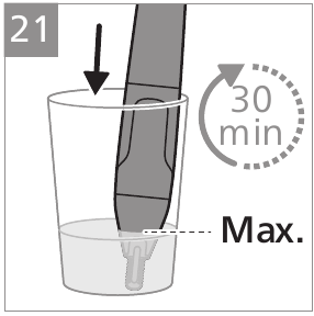 Tipp: Az alapos tisztításhoz merítse a vágófejet egy pohár meleg vízbe kb. 30 percre, hogy áztassa és felpuhítsa a szennyeződéseket (21. ábra). Ügyeljen arra, hogy a fogantyút ne merítse vízbe. Ezután kapcsolja be a készüléket, és öblítse le a vágóelemet a csap alatt, hogy eltávolítsa a makacs szőrszálakat/szennyeződéseket.