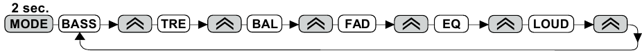 Mód beállítások (Basszus/Magas/Egyensúly/Fader/EQ/Hangerő): Nyomja meg a MODE (Mód) gombot 2 másodpercig, majd nyomja meg a