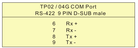 | Bővítő kommunikációs port RS-422 (COM1) RS-485 (COM2) | Aszinkron átviteli módszer: RS-485 / RS-422 Adathossz: 7 vagy 8 bit, Stop bitek: 1 vagy 2 bit Paritás: Nincs/Páratlan/Páros, Átviteli sebesség: 9,600bps ~ 115,200bps RS-422: 9 PIN-es D-SUB dugó RS-485: 5 PIN-es eltávolítható csatlakozó | |