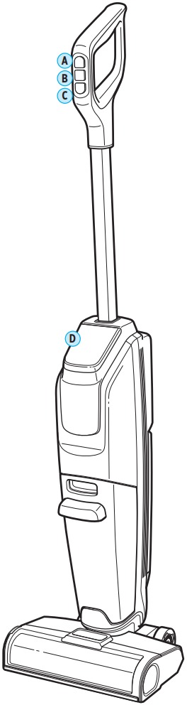 Nyomja meg a bekapcsológombot (C) a bekapcsoláshoz, és válassza ki a Power Vac vagy a Power Mop módot a kijelzőn (D) található módválasztó gombbal (B). Ha mindkét módot egy munkamenetben használja, kezdje a Power Vac móddal a száraz tisztításhoz; a Power Mop mód használata után az alkatrészeknek 24 órára van szükségük a száradáshoz.