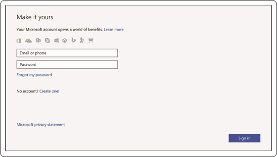 Jika Anda menyambung ke jaringan nirkabel yang aman, masukkan kata sandi untuk akses jaringan nirkabel saat diminta. - Masuk ke akun Microsoft Anda atau buat akun lokal