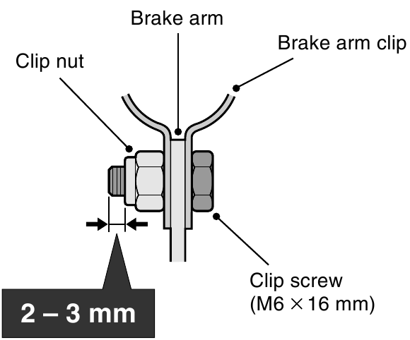 - Setelah memasang klip lengan rem, periksa apakah sekrup klip menonjol sekitar 2 – 3 mm dari permukaan mur klip.