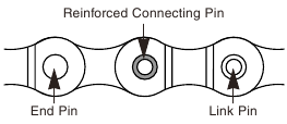 - Tersedia dua jenis pin penghubung yang diperkuat. Pastikan untuk memeriksa tabel di bawah ini sebelum memilih pin yang akan digunakan. Jika pin penghubung selain pin penghubung yang diperkuat digunakan, atau jika pin penghubung yang diperkuat atau alat yang tidak sesuai untuk jenis rantai digunakan, gaya penghubung yang memadai mungkin tidak diperoleh, yang dapat menyebabkan rantai putus atau lepas.