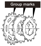 - Selalu pastikan untuk menggunakan set sprocket yang memiliki tanda grup yang sama. Jangan pernah menggunakan dalam kombinasi dengan sprocket yang memiliki tanda grup yang berbeda.