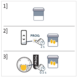 - Tekan tombol PROG hingga produk bermotor bergerak naik dan turun: mode pemrograman diaktifkan.