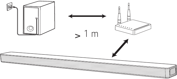 Jauhkan sound bar dan subwoofer dari perangkat (mis. router nirkabel, oven microwave, dll.) lebih dari 1 m untuk mencegah interferensi nirkabel.