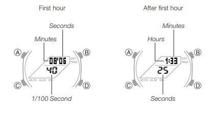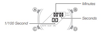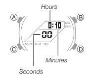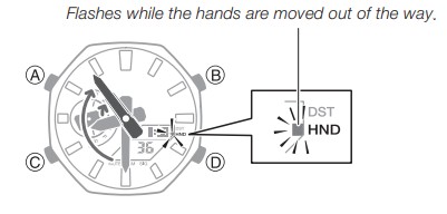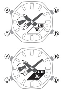 - Premere B e C contemporaneamente. Questo farà sì che le lancette delle ore e dei minuti si spostino in una posizione in cui non ostruiscono la visuale del display digitale.